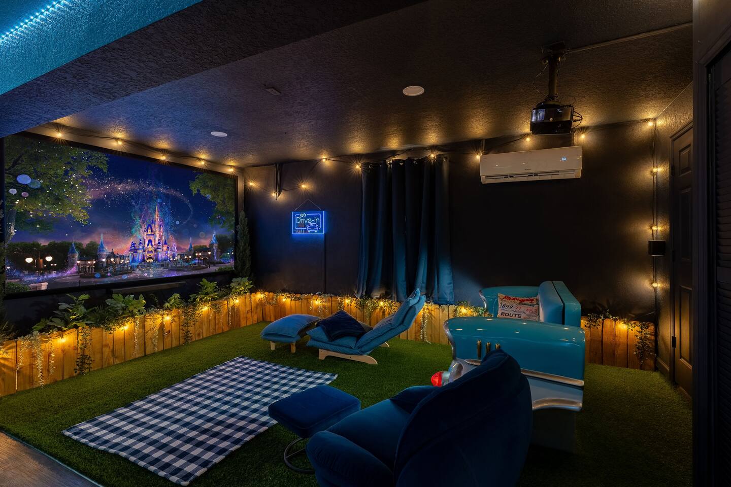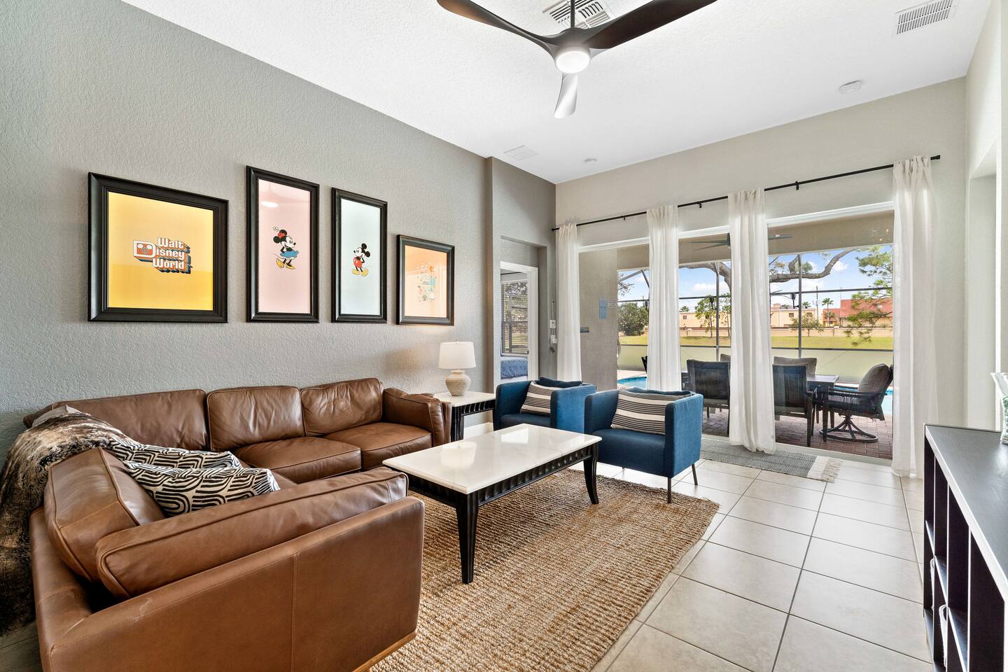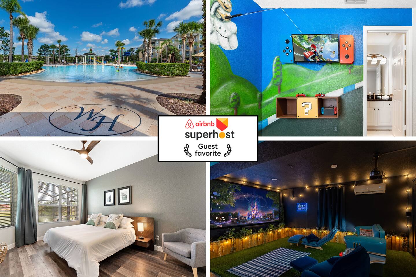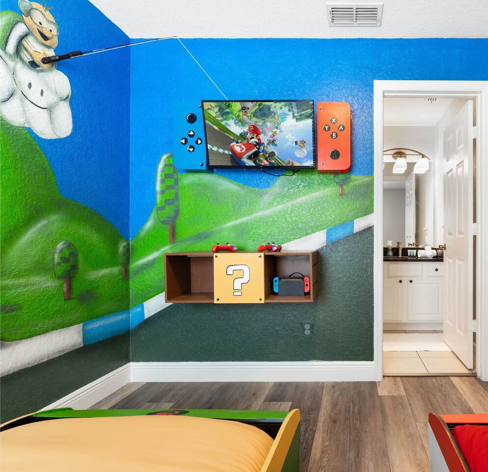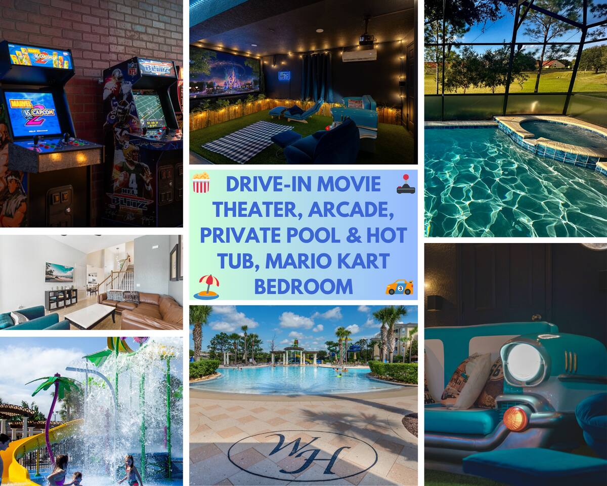 Welcome to my home in Windsor Hills, a 5B/5BA luxurious mid century modern home minutes to the parks. • 🎬 Drive-in themed movie theater • 🏎️ Mario Kart themed bedroom • 🏝️ Private pool and spa • 🕹️ Game room with arcades & Xbox • 🖼️ No neighbors behind the home • 🎟️ Short walk to clubhouse with pool & slides • 📶 High speed Wi-Fi • ⭐️ Top resort community *Windsor Hills*